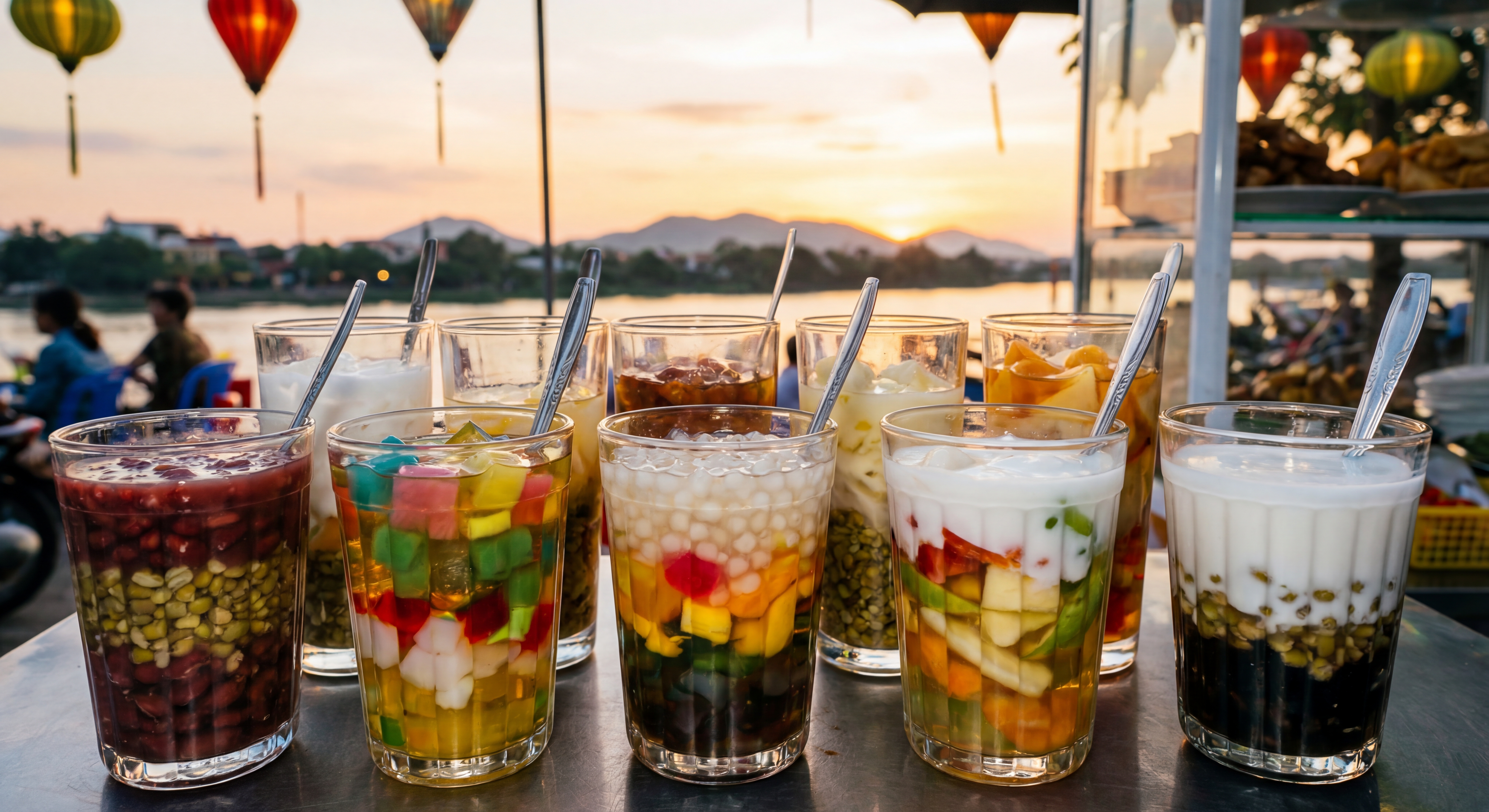 Sau khi đã "hành hạ" vị giác với đủ các cung bậc chua - cay - mặn, hãy xoa dịu chiếc bao tử bằng một ly chè Huế ngọt ngào. Người ta gọi là "Chè Hẻm" vì những quán chè ngon nhất thường nằm sâu trong những con hẻm nhỏ, lung linh ánh đèn vàng mỗi tối.